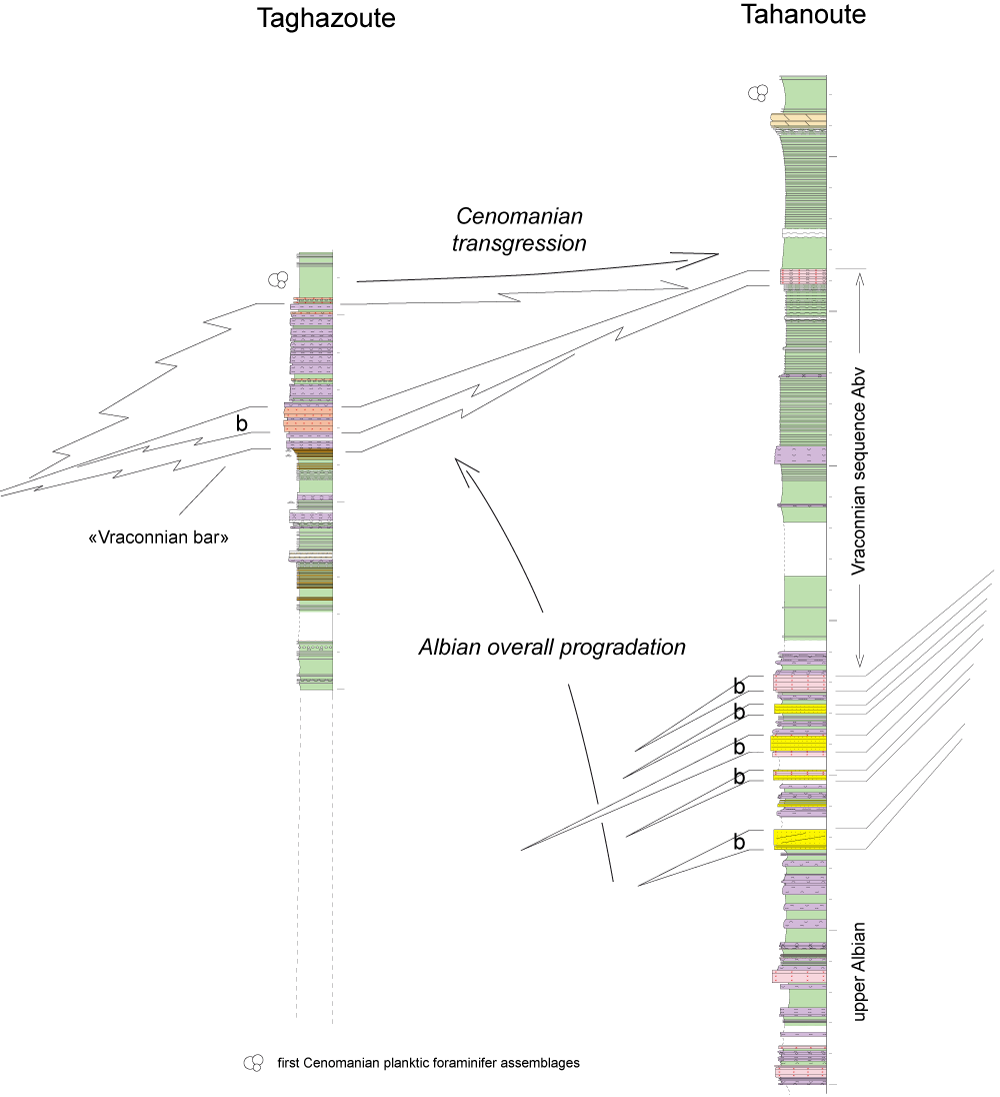 Figure 6: Correlation between upper Albian sequences of the Tahanoute and Taghazoute sections. b, beach facies.