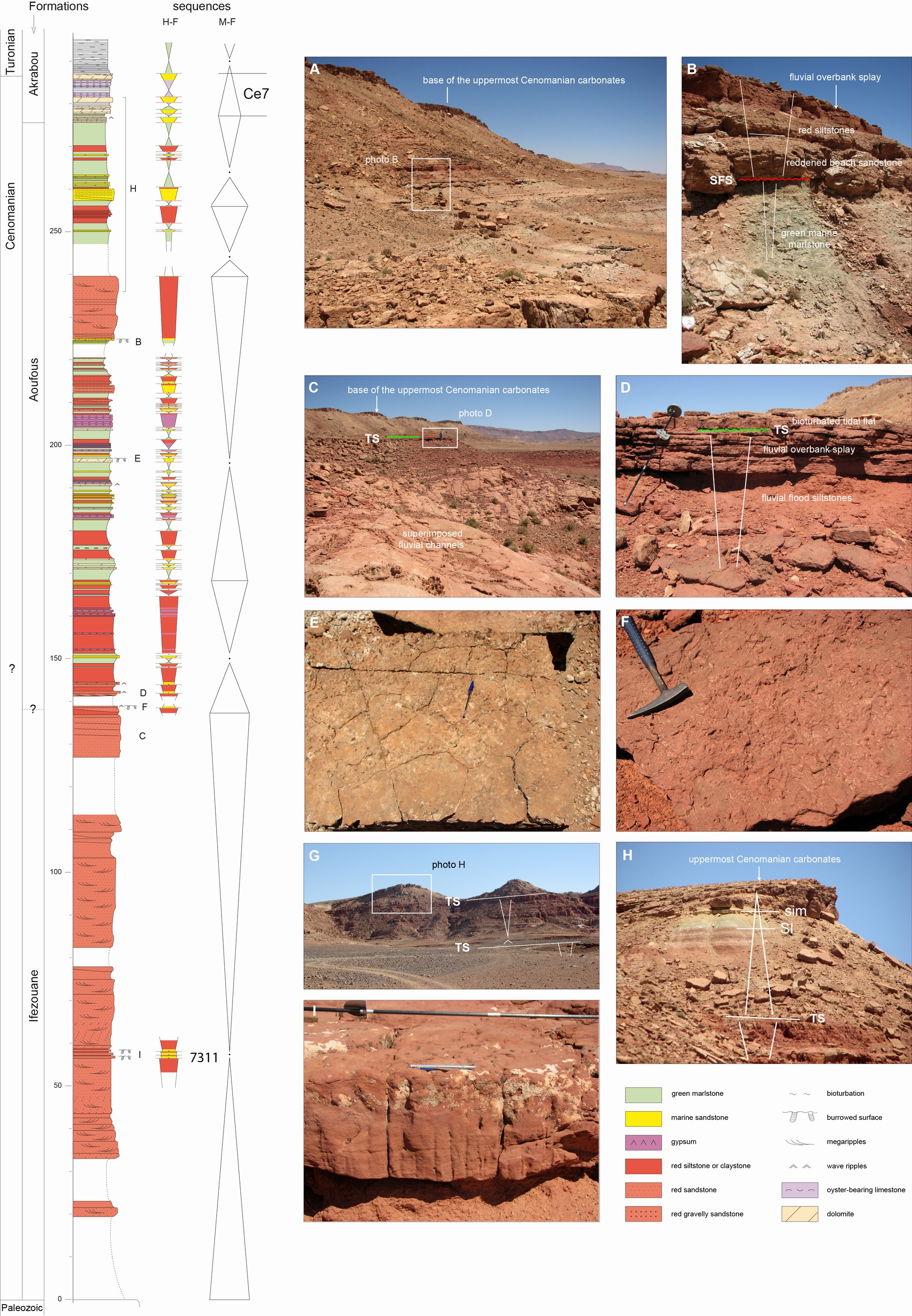 Figure 16: Tinghir section. A, view of the upper part of the section showing the alternation of green (marine) and red (continental) deposits; B, detailed view; C, upper part of a medium-frequency sequence showing superimposed fluvial channels filled with coarse-grained sandstones (C), and finer-grained, evenly-stratified sandstone of splay deposits (D); E, F and I, different views of evenly-stratified medium-grained sansdtones showing marine burrows, and interpreted as tidal flat deposits, post-depositionally reddened by the fluvial deposits below and above; G and H, uppermost part of the section showing the gradual transition from the fluvial and the full-marine deposits of the C-T transition.