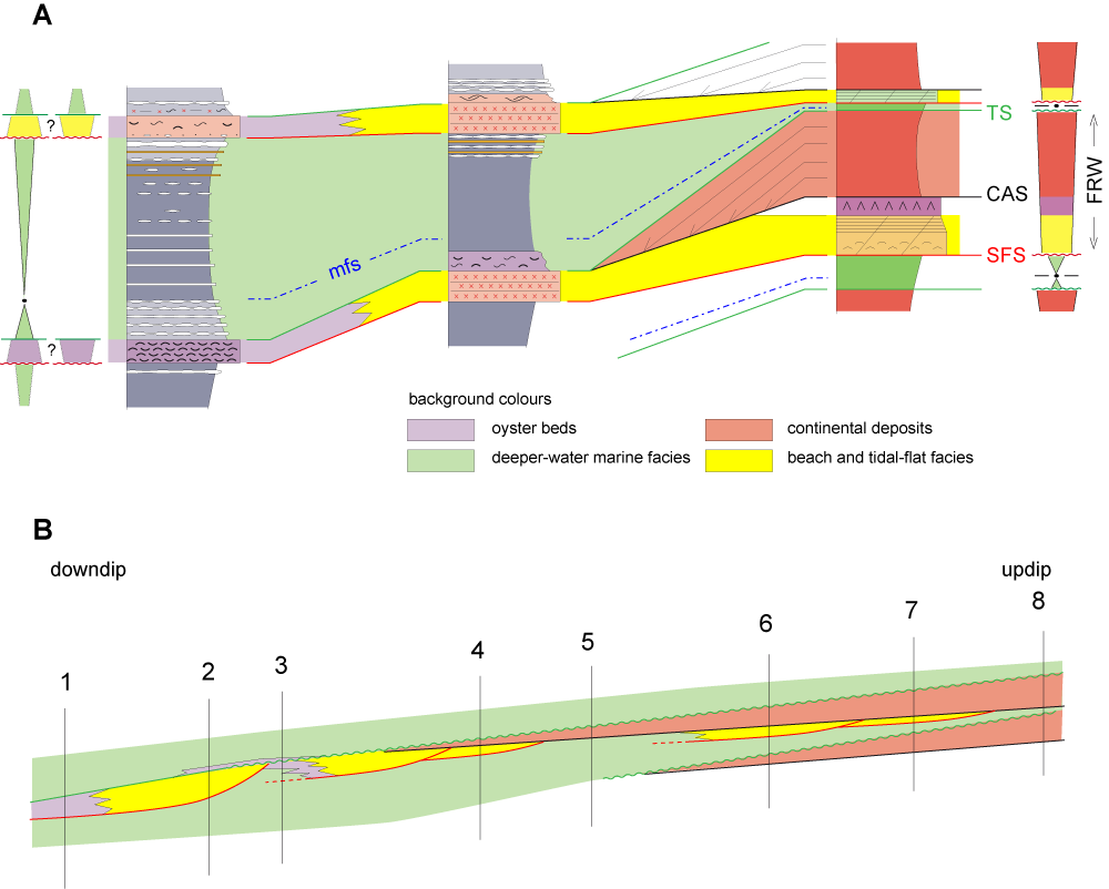 Figure 18: The depositional model for high-frequency sequences. A, correspondences between the distal and proximal type-sequences (CAS, continental aggradation surface; FRW, forced regressive wedge). B, a more realistic illustration of the forced regressive wedge, in which the irregular stepped forced regressions may create all the H-F sequences (1 to 8) seen in outcrops along the transect. Explanations in the text.