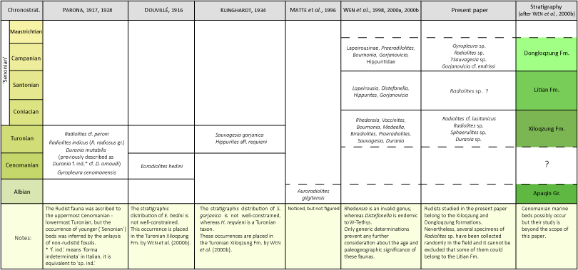 The first goal of this paper is to re-evaluate in modern terms the taxonomy of this remarkable rudist collection from the De Filippi expedition in order to refine the Upper Cretaceous stratigraphy. The second goal is to place this area into a wider paleobiogeographic framework by comparing it with more recently published research (Wen, 1998; Wen et al., 1998; Chinese Academy of Sciences, 2000).