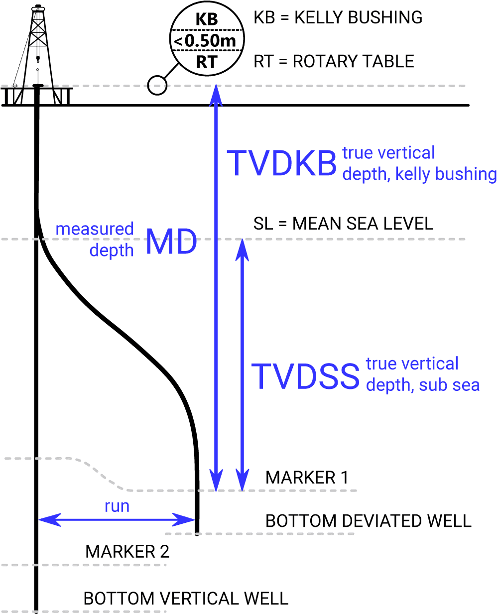 Figure 3: Schematic representation of vertical and deviated wells at the same location, showing the relationship between measured depth (MD), true vertical depth referenced to Kelly Bushing (TVDKB), true vertical depth referenced to the rotary table (TVDRT), and true vertical depth below mean sea level (TVDSS). The diagram also illustrates the GPS locations at the level markers, with the projections of the marker locations on a horizontal plane separated by a distance referred to as the run.