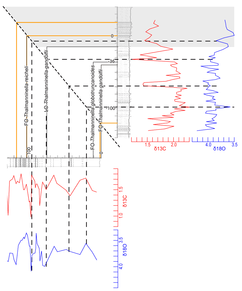 planktonic foraminifer analyses; orange lines = key lithologic layers; thin