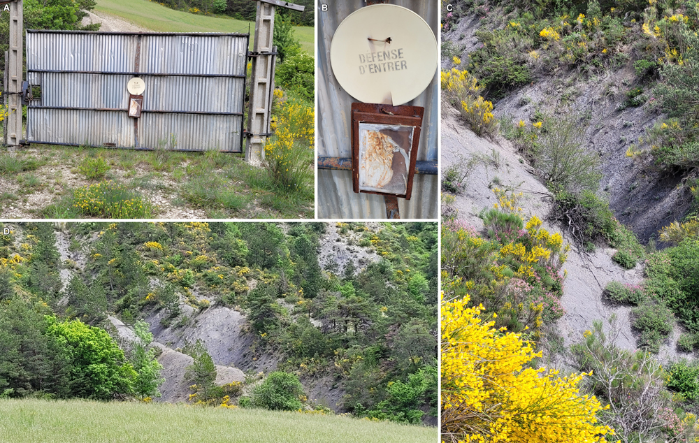 Figure 6: Issues with the Cenomanian GSSP at Mont Risou, Saint-André-de-Rosans (Hautes-Alpes, SE France), 23/05/2024. A) the steel gate; B) the warning sign; C) the 'typical outcrop' (Kennedy et al., 2004); D) the GSSP is hidden somewhere on the hillside.