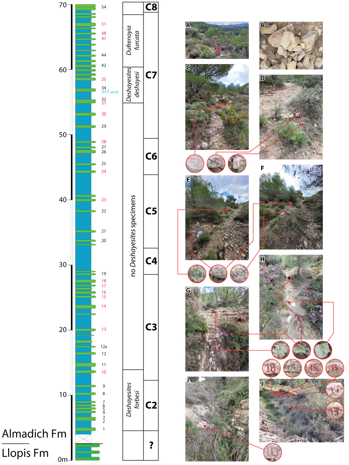 Figure 11: The Cau section: Lithologic log redrawn from Ruiz-Ortiz et al. (2016); ammonite zones from Moreno-Bedmar et al. (2012), modified; Carbon-isotope stratigraphy from Ruiz-Ortiz et al. (2016). A) The section recently evaluated (22/11/2025) along a vía pecuaria and an arroyo that crosses privately owned properties; B) Loose rock marked with the number 33, found well above the actual section in the vía pecuaria; C) Bed number 51, located beside the vía; D) Beds 47 and 48 at the junction of two vías; E) Beds 31 and 35; F) Beds 30 and 31; G) Beds 24 and 28; H) Beds 23? and 24; I) Bed 10 (no lower beds are visible); J) Beds 13, 14, 15, 16, 17, and 18.