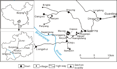 ). The type locality for Falang Formation is at Falang Village, near the Huangjiang Big Gorge, ca 40 km south of Guanling Town (,
