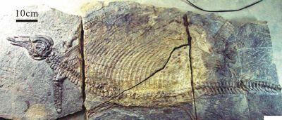 Figure 7: Ichthyosaur Qianichthyosaurus zhoui C. , 1999. YIGMR TR00040, nearly complete skeleton, 1.28 m long. Note embryos below rib cage of mother.
