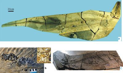 Figure 8: Ichthyosaur Guizhouichthyosaurus tangae & in et alii, 2000 (= Cymbospondylus asiaticus C. & , 2002, ? = Panjiangsaurus epicharis X. & , 2003). 8a. Complete skeleton with 5.385 m long, Holotype, TR00001, Scale equals 30cm; 8b. Gastroliths composed mainly of siliceous limestone and quartzite in same skeleton as fig. 1, Scale equals 5cm; 8c. An incomplete skeleton with the gastroliths, composed of fish scales and fragments of bivalve and brachiopod shells, with 210cm long, TR00041. The scale equals 15cm.