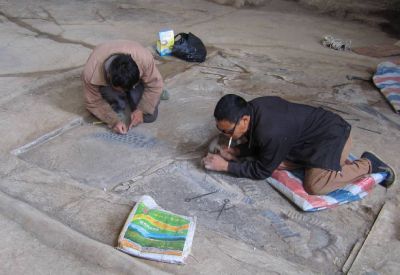 Figure 24: Preparing the marine replete skeleton preserved in their original position on the black mudstone bedding planes for national GeoPark in Wolonggang.