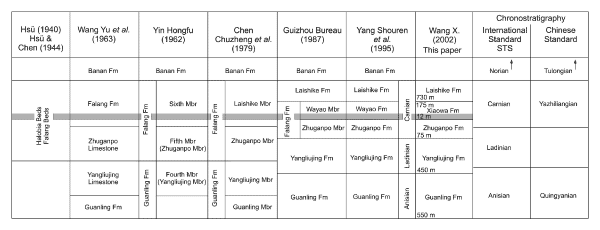 Figure 5: Middle–Upper Triassic stratigraphic subdivision of the Guanling area with the indicators of the interval yielding the Guanling Fossil Group (GFG), Xingyi and Paxian biotas.