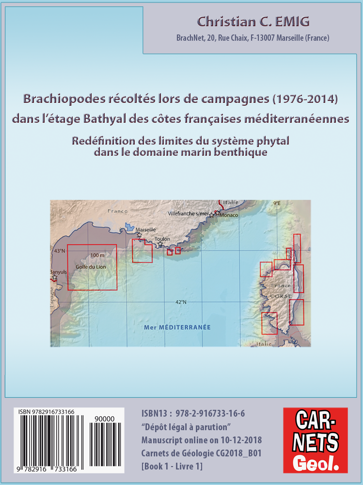 Livre 1 [2018] : Brachiopodes récoltés lors de campagnes (1976-2014) dans l’étage Bathyal des côtes françaises méditerranéennes. Redéfinition des limites du système phytal dans le domaine marin benthique, par Christian C. EMIG.